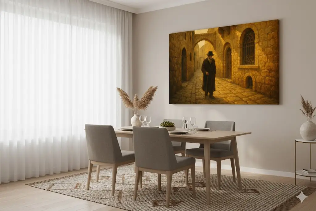 תמונה מרגשת ומלאת אווירה של סמטה עתיקה בעיר האבן, בה צועד יהודי זקן עטור זקן ובגד מסורתי, נשען בעדינות על מקלו. אור זהוב של אחר צהריים שוטף את הקירות ויוצר תחושת חמימות, נוסטלגיה וקדושה. יצירה שמעבירה שקט פנימי, עומק רוחני וחיבור לשורשים — מושלמת לתלייה בבית, במשרד או בחלל תפילה.