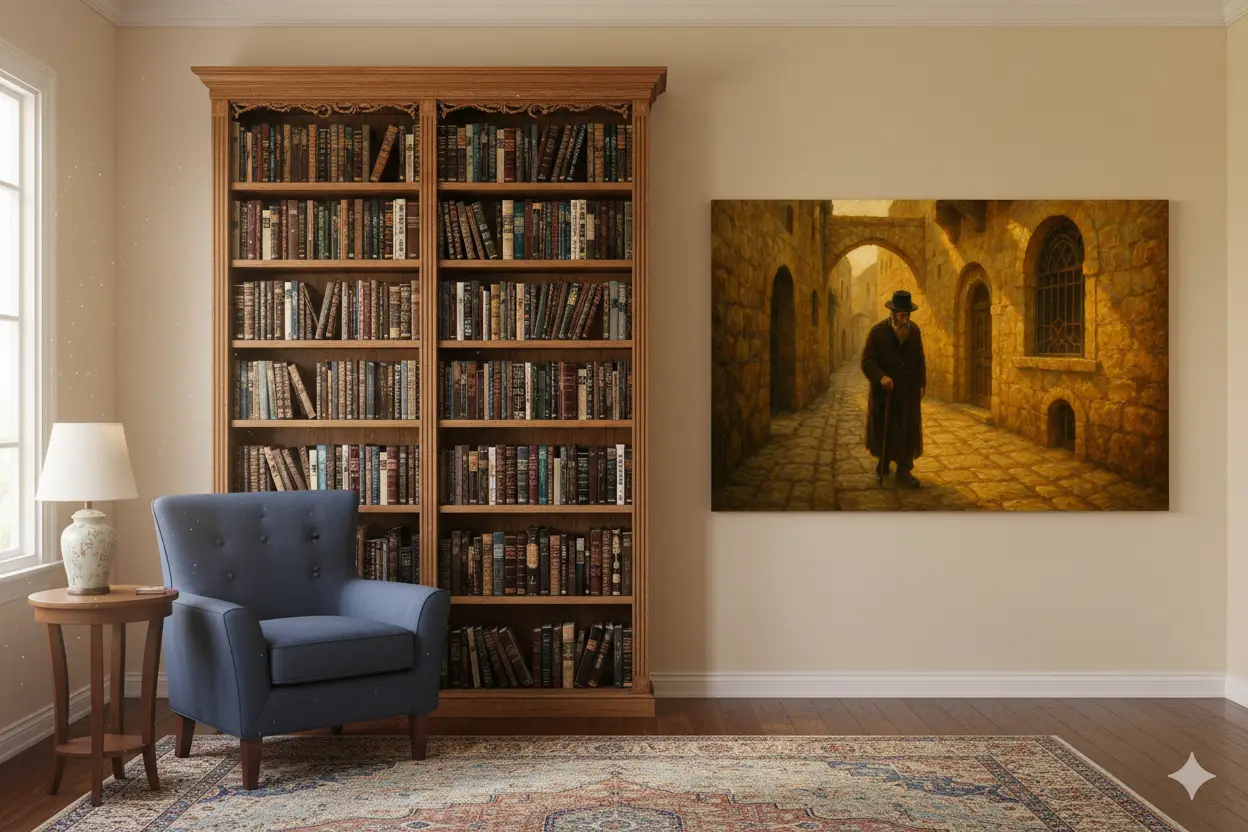 בציור מלא הבעה זה, נראה יהודי מבוגר מהלך לבדו בסמטה עתיקה, עטוף במעיל ארוך ובכובע שחור, נשען בעדינות על מקלו. האבן הירושלמית סביבו נשטפת באור זהוב ורך של אחר הצהריים, היוצר אווירה חמימה ונוגעת ללב. יש בציור תחושת זמן שעמד מלכת — רגע של התבוננות פנימית, של מסע שקט בין קירות האבן הרוויים בזיכרונות ותפילה.