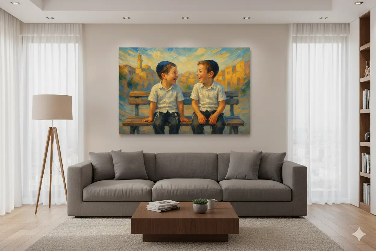 תמונה מחממת לב של שני ילדים יושבים על ספסל וצוחקים יחד, על רקע נופי ירושלים הצבועים באור זהב רך. היצירה משלבת סגנון ציור שמן קלאסי עם משיכות מכחול חיות שמשרות תחושת תום, שמחה וחברות אמיתית. הצבעים החמים והאור הירושלמי יוצרים אווירה מרגיעה שמכניסה אור ואנושיות לכל חלל.