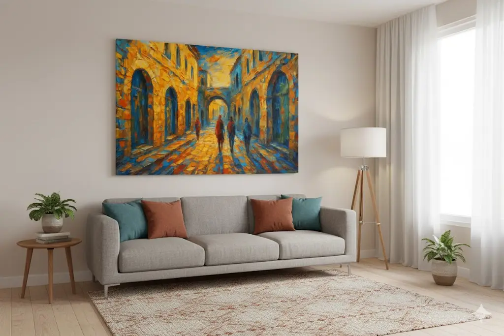 יצירה עכשווית מלאת חיים של סמטה ירושלמית באור שקיעה, בצבעים עזים של זהב וכחול המשתלבים בהרמוניה מופלאה. משיכות המכחול החופשיות יוצרות תנועה, חום ואור, והדמויות ההולכות ברחוב מוסיפות תחושת חיים וסיפור. ציור שמשדר אנרגיה, עומק וגעגוע – מושלם לסלון, משרד או חלל אומנותי.