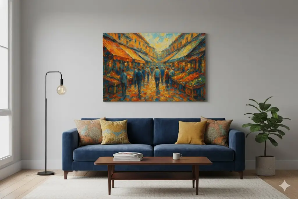 ציור שמן עז צבעים של שוק מחנה יהודה, מלא חיים ותנועה. דמויות מטושטשות נעות בין דוכני הפירות והירקות, כשהצבעים החמים של הכתום והאדום מתמזגים עם גווני כחול וצהוב, יוצרים תחושת תנועה, חום ואנרגיה ירושלמית ייחודית. התמונה לוכדת את רוח השוק — החיוניות, ההמולה, והיופי שבחיי היומיום.