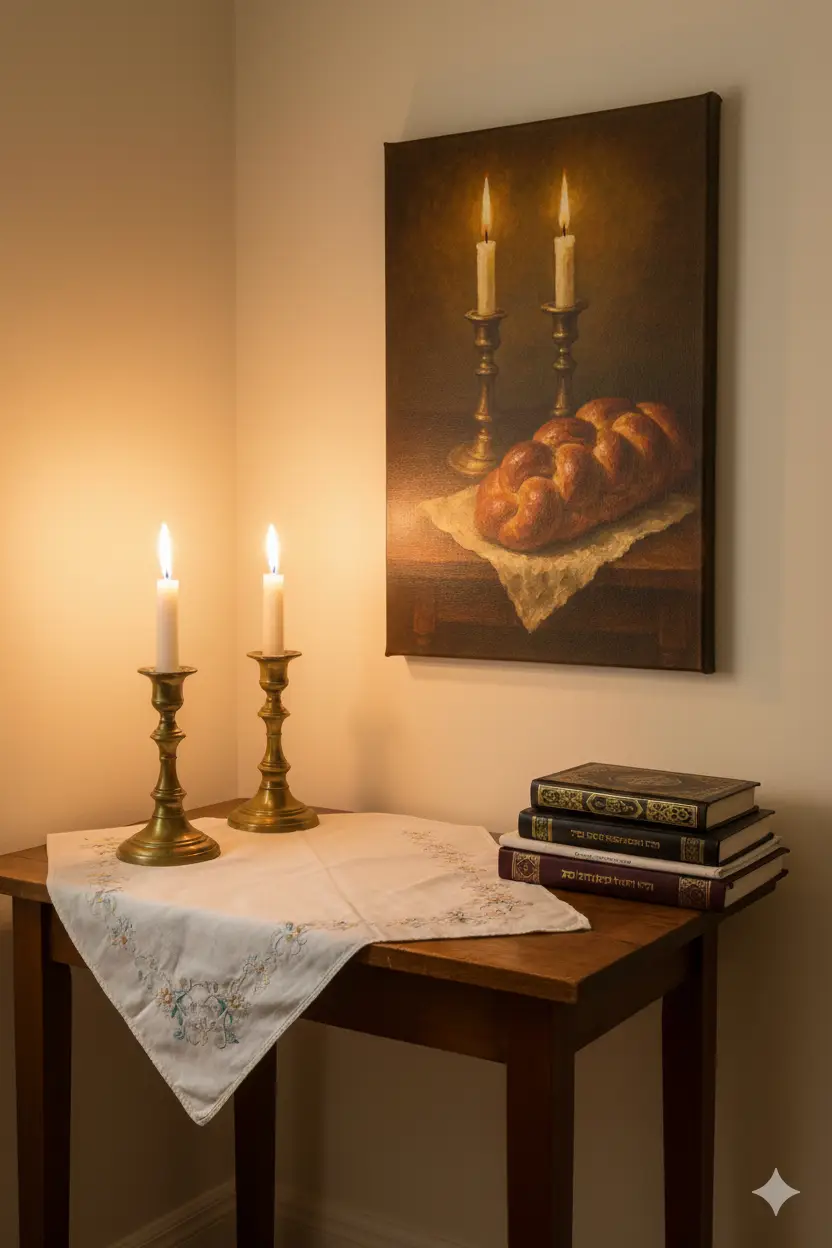 ציור שמן מלא חמימות של שולחן שבת מסורתי — שתי נרות דולקים באור רך, ולצידם חלה קלועה המונחת על מפה לבנה. האור הזהוב המשתקף מהנרות ממלא את הסצנה בשלווה ובקדושה, ומעביר תחושת בית, מסורת ואהבה שקטה. התמונה מבטאת את רוח השבת — פשטות, אור פנימי, וחיבור נצחי בין אדם לאלוקיו.